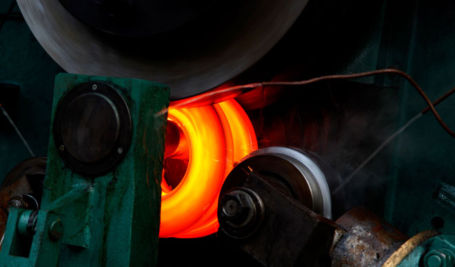 該智能流水線將鍛壓和碾壓軋制工藝融為一體,從毛坯下料、上料、加熱、初鍛、碾壓成型到成品輸出,實(shí)現(xiàn)了自動(dòng)化流水作業(yè)。它是我公司《起重機(jī)車(chē)輪碾壓成型新工藝裝備》、《起重機(jī)車(chē)輪鍛壓用新型加熱工藝裝備》等多項(xiàng)專(zhuān)利技術(shù)成果轉(zhuǎn)化為生產(chǎn)力的標(biāo)志。